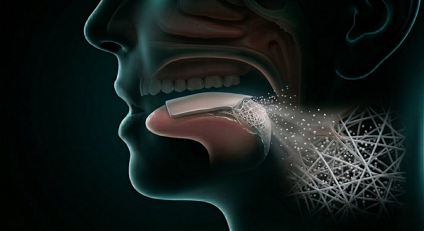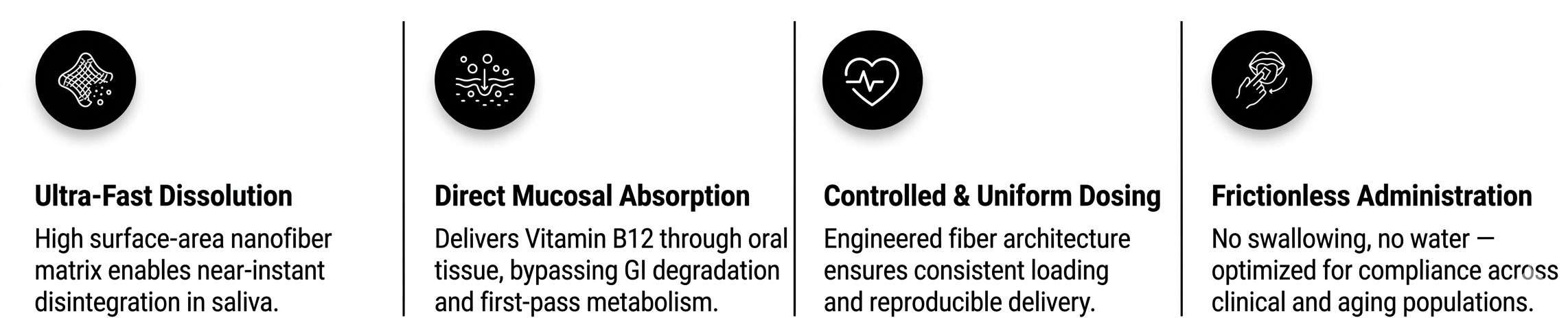 Electrospun nanofiber films create a high-surface-area matrix that dissolves instantly and delivers Vitamin B12 directly through the oral mucosa — eliminating digestive loss.