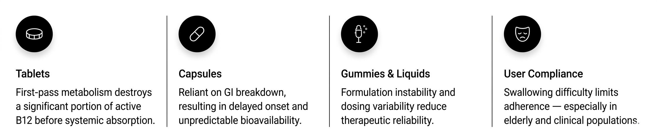 Most B12 delivery formats rely on digestion — resulting in slow uptake, variable absorption, and poor patient compliance.